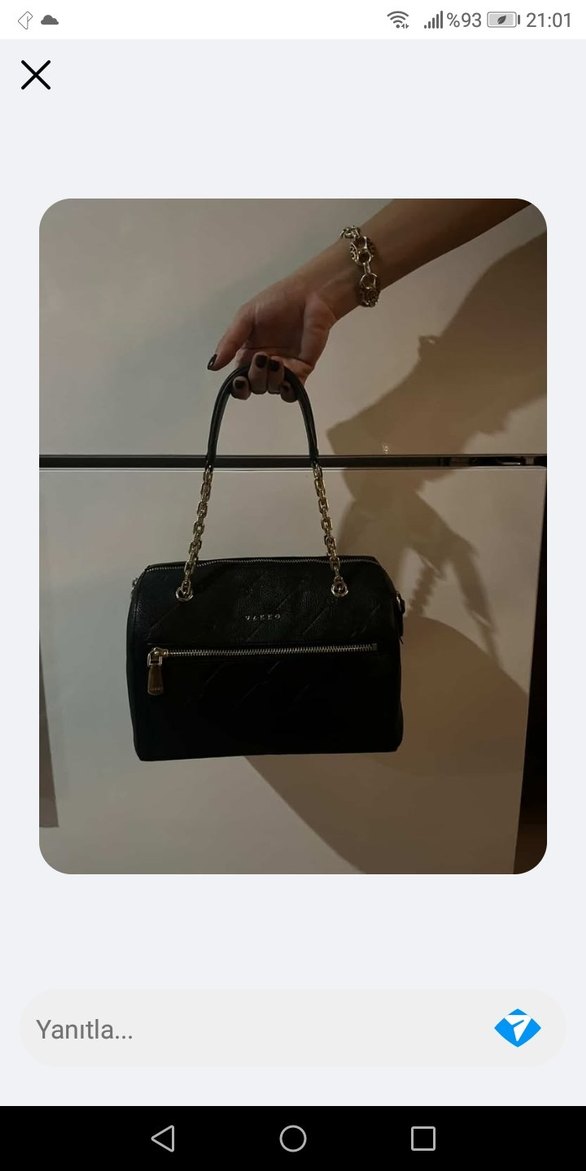 Siyah deri çanta, yılan desenli ve zincir detaylıdır. Klasik şıklık ve Paris sokak modasını yansıtır. Sıfır gibidir toz torbası ve uzun askısı da mevcut