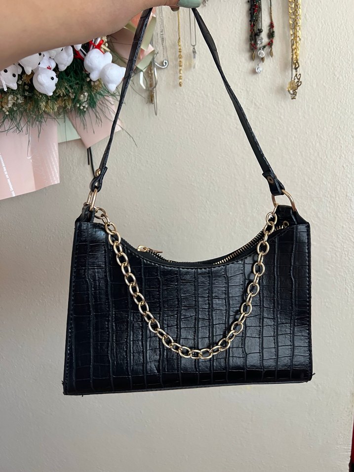 Siyah yılan desenli deri çanta, zincir detaylı ve günlük kullanım için uygun, trend sokak stiliyle uyumlu.