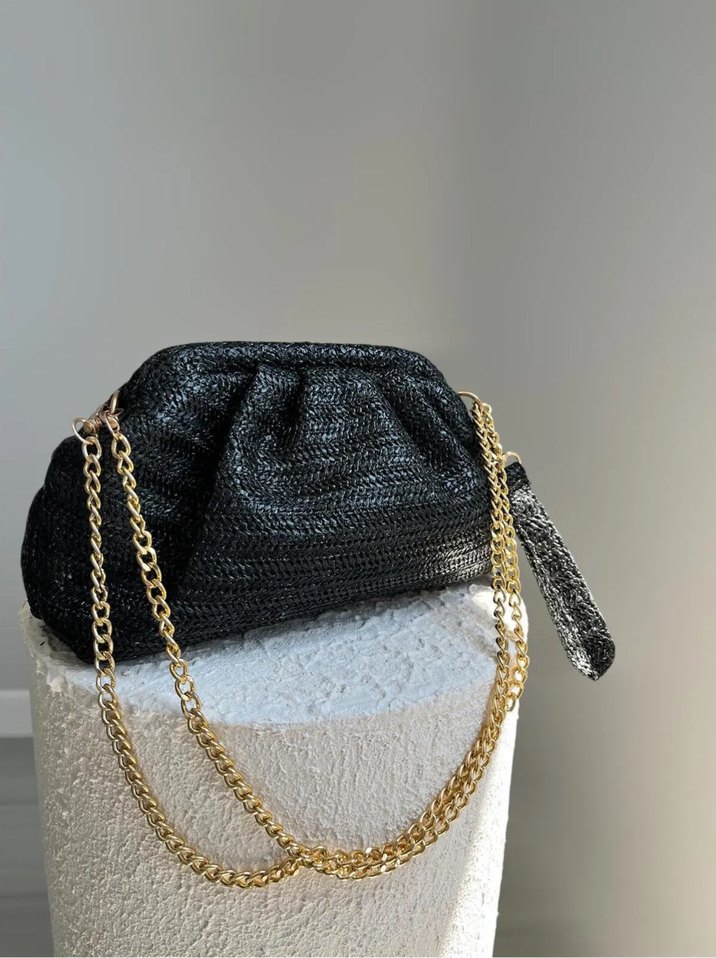 Sentetik kumaştan yapılmış, parlak yılan deseni ve altın zincir detaylı siyah kadın clutch çanta. Modern klasik stile uygun, günlük kullanıma uygundur.