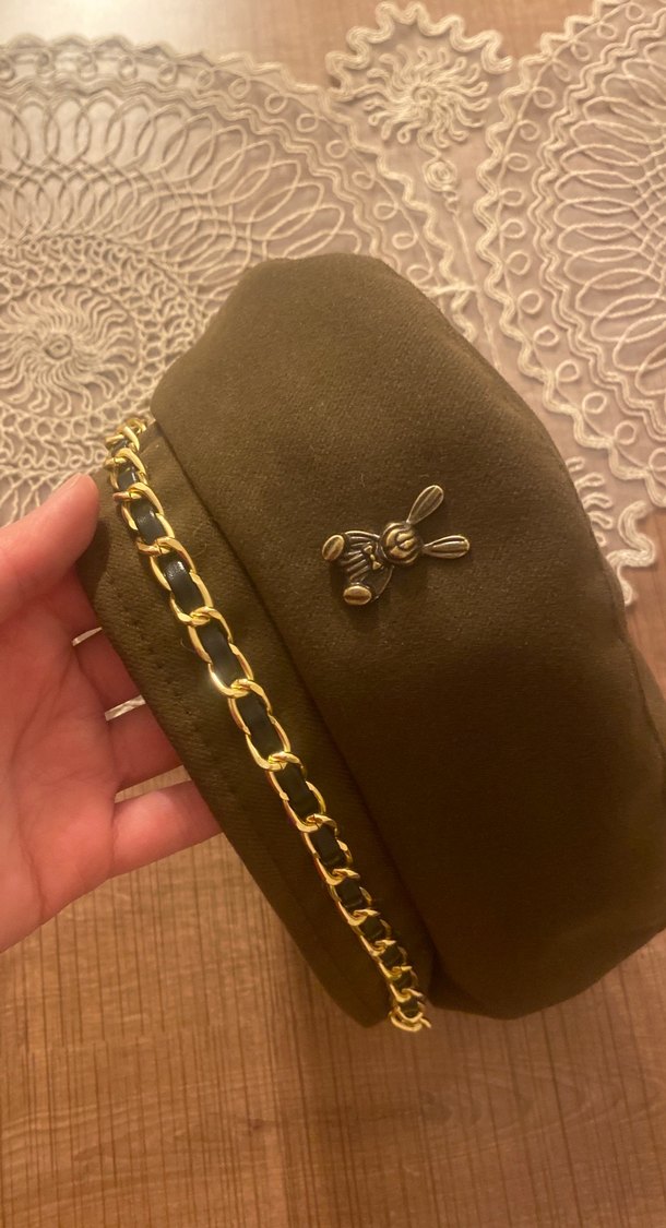 Koyu kahverengi süet kadın şapka, altın zincir detayı ve küçük tavşan rozeti ile Paris tarzı counterculture görünüm sunar.