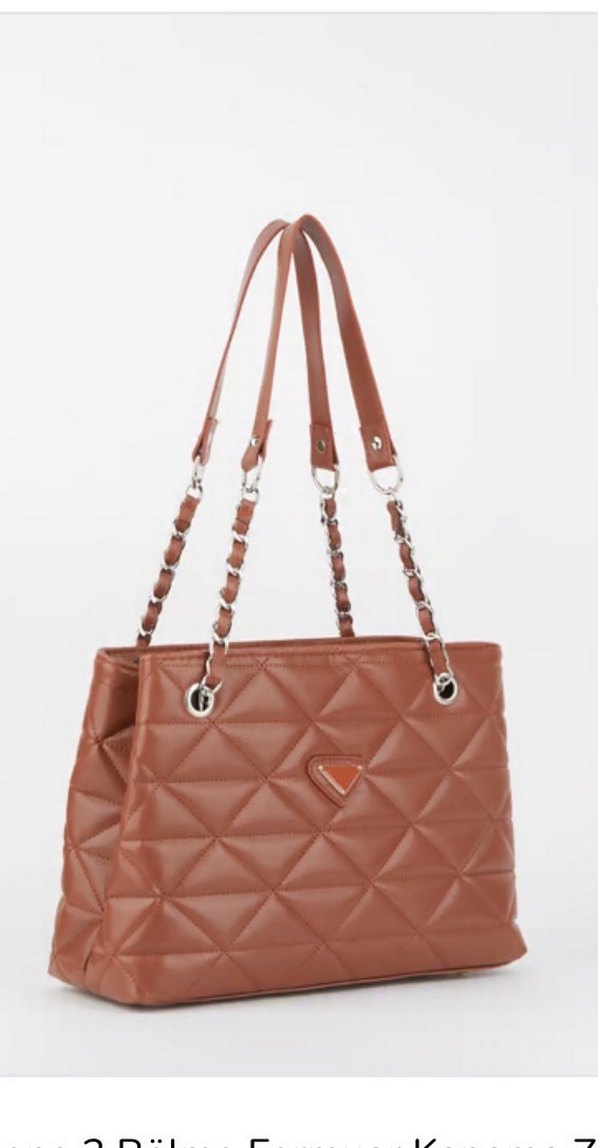 Parlak taba suni deri kadın çanta, zincir detaylarıyla minimalist ve çağdaş tarzda. Günlük kullanım için uygun.