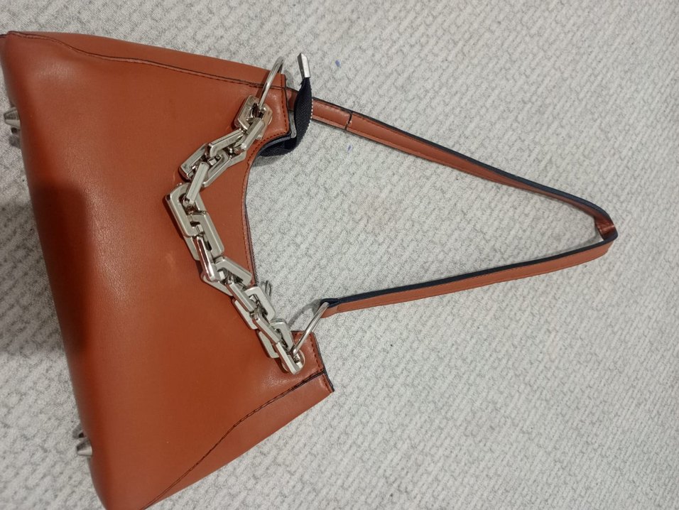 Taba deri kadın çanta, zincir detaylı ve minimalist tarzda, günlük kullanıma uygun şık bir tasarıma sahiptir.