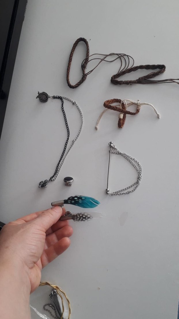 Zincir detaylı, turkuaz renkli deri erkek aksesuarı. Desensiz ve şık tasarıma sahip, farklı metal ve deri kombinasyonu içerir. broş vatka Bileklik hepsinin fiyatıdır