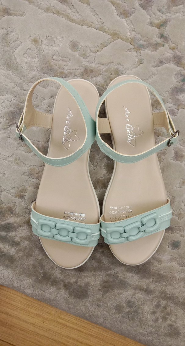 Turkuaz renkte, zincir detaylı dolgu topuk kadın sandalet. Yumuşak kauçuk malzemeden üretilmiş, minimalist ve çağdaş tasarıma sahip günlük kullanıma uygun. 40 no