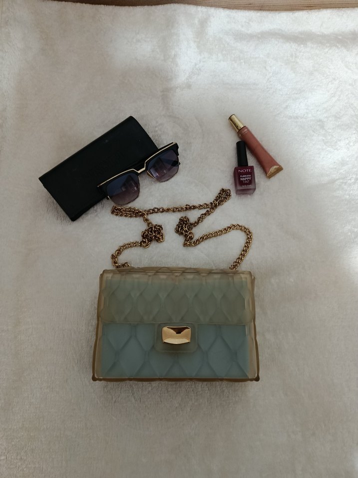 turkuaz renkli, zincir detaylı ve hafif plastik malzemeden yapılmış kadın çantası. Günlük kullanım ve trend sokak stiline uygundur. çift kullanımlı mavi kutu içinden çıkıyor ister şefaf kullanabilirsiniz ister kutulu
