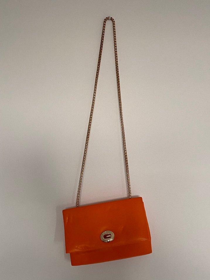 Zincir detaylı askısı ve parlak turuncu deri malzemesiyle kadın çantası. Minimalist ve desensiz tasarımı günlük kullanıma uygundur.