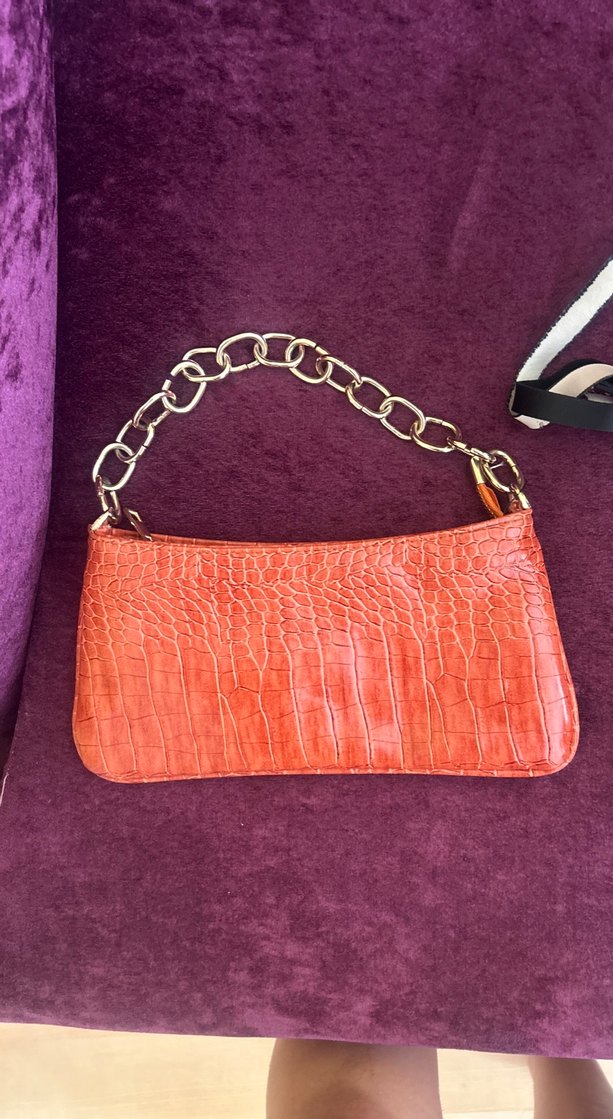 Turuncu yılan desenli deri çanta, zincir detaylı sapıyla trend sokak stili için uygun. markasını bilmiyorum