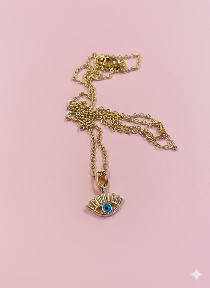 Uzun altın zincirli, mavi ve renkli detaylı göz figürlü bohem tarzda kolye.