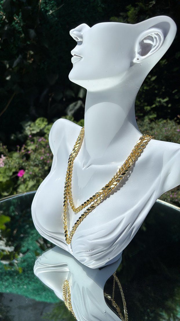 Parlak yüzeyli, zincir detaylı ve yılan desenli uzun altın kadın kolyesi, şık ve çağdaş bir görünüm sunar. ✨
