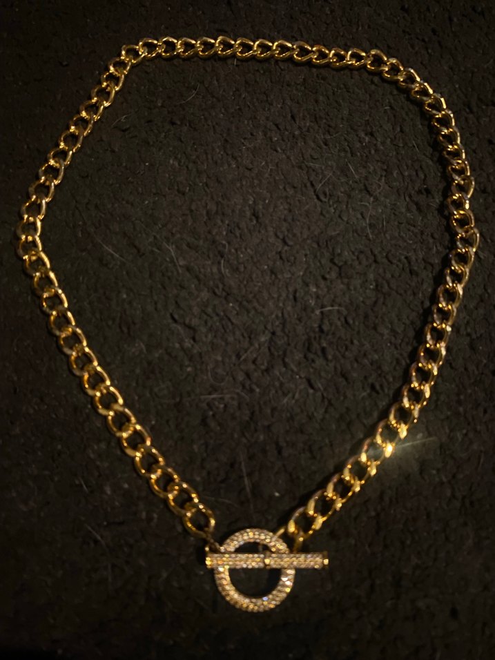 Uzun altın kolye, zincir detayları ve parlak yılan deseniyle dikkat çekiyor. Günlük kullanıma uygun, gösterişli sokak tarzında bir aksesuar.