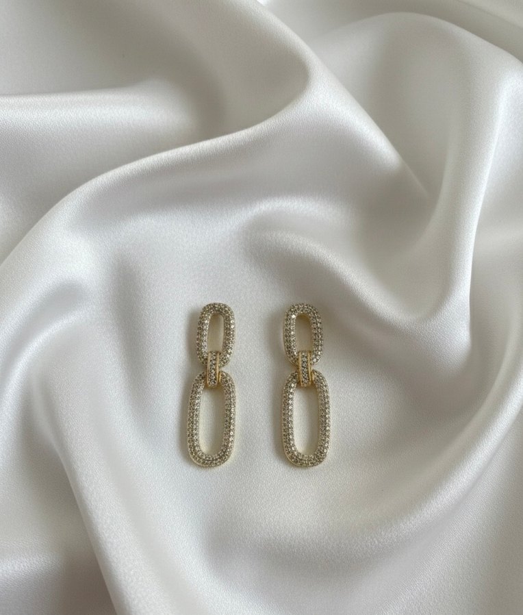 Zincir detaylı, parlak yüzeyli uzun altın küpeler. İnce yılan deseni ve klasik şıklık için uygun, düğünlerde kullanılabilir.
