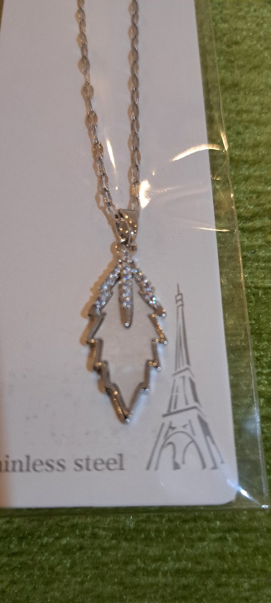 Uzun beyaz kolye, zincir detaylı ve nakışlı yaprak şeklinde ucu ile paslanmaz çelikten üretilmiştir. Klasik zarafet ve bohem tarzlar için de uygundur.