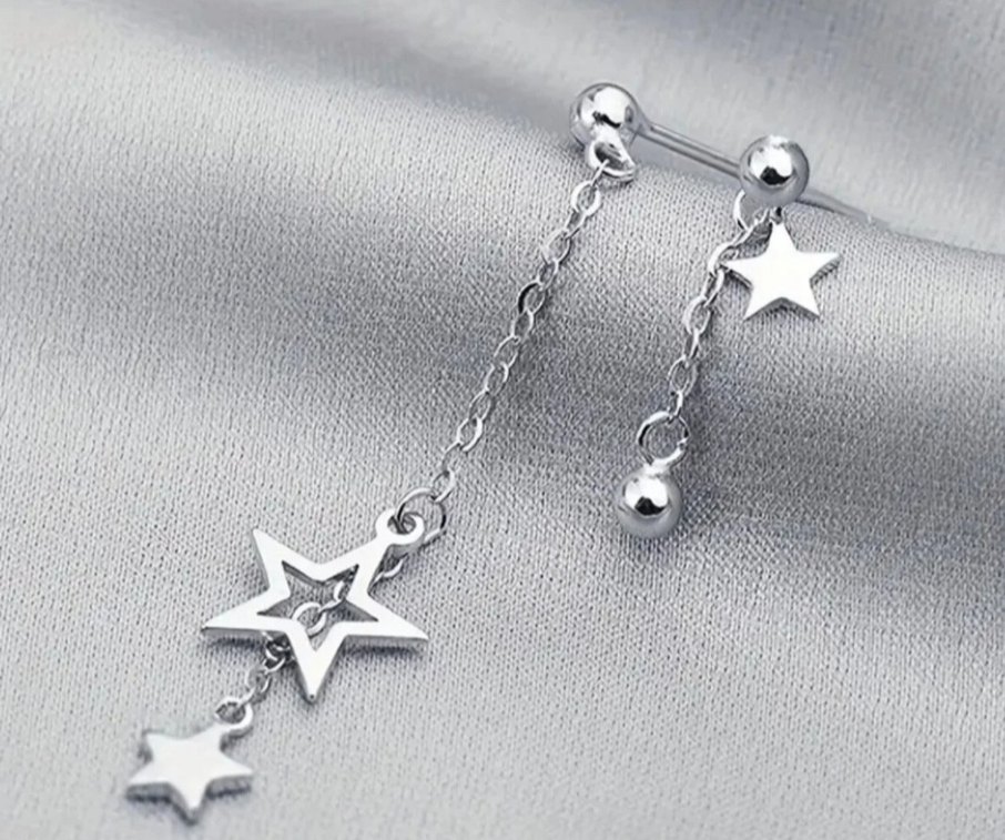 Parlak zincir ve yıldız detaylı uzun beyaz küpe, minimalist rock punk tarzına uygun.