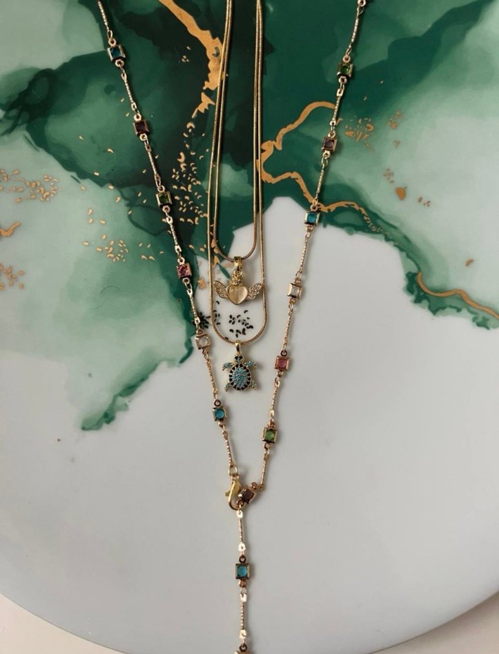 Zincir detaylı, yılan desenli ve renkli taşlı uzun altın kolye, bohem tarzıyla günlük kullanıma uygundur.