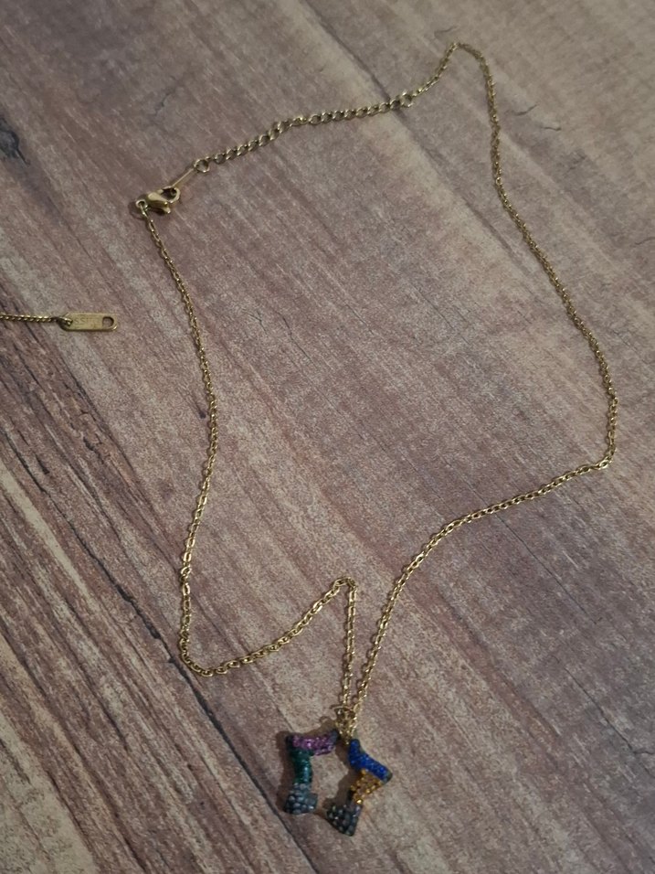 Detaylı zincir ve çok renkli tie-dye yıldız uçlu uzun bohem tarzı kadın kolye, günlük kullanım için uygun ve minimal bir görünüme sahip.