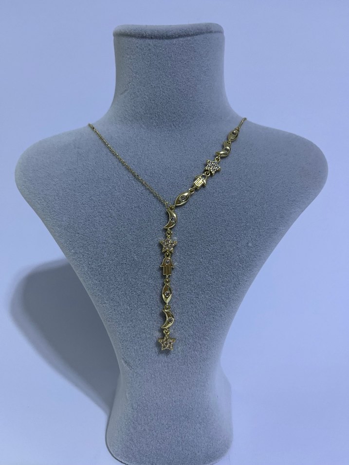 Parlak altın renkte, yılan desenli detaylı zincirleriyle uzun bohem tarzda minimalist kadın kolyesi.