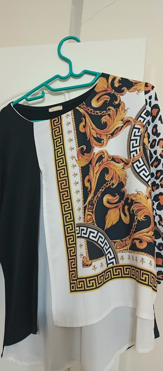 Zincir detaylı, uzun kollu, bol kesim kadın bluz. Sentetik kumaştan, koyu altın tonlarında, modern klasik tarzda günlük kullanıma uygun.