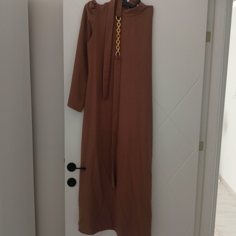 Yüksek yaka ve uzun kollu, bol kesim kahverengi uzun elbise. Zincir detayına sahip, sade ve günlük kullanıma uygun.