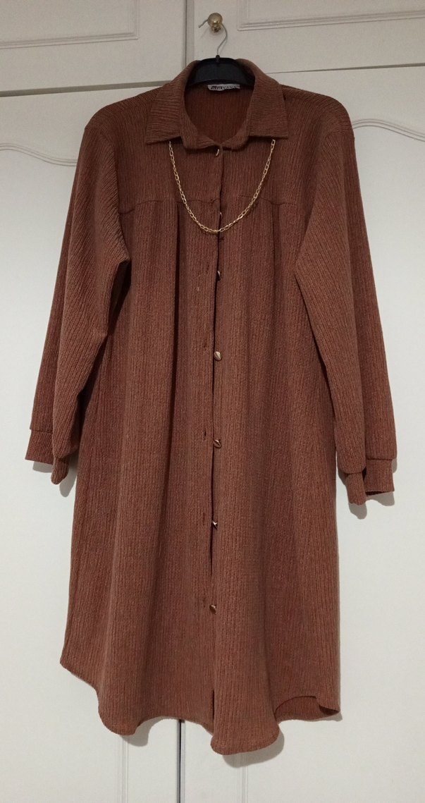 Uzun, bol kesim kahverengi triko elbise, yakalı ve uzun kollu, zincir detaylı. Yumuşak keten kumaştan, rahat ve sıcak.