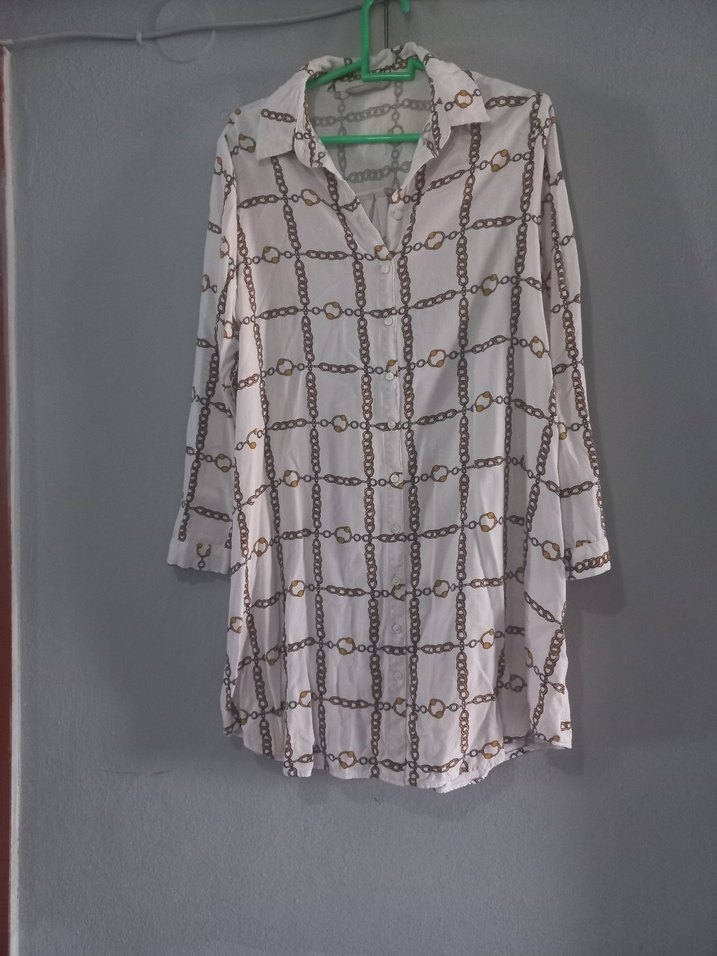 Zincir detaylı, uzun kollu, bej renkli, bol kesim gömlek. Yaka tipi klasik ve şehir modasına uygun, günlük kullanım için ideal.