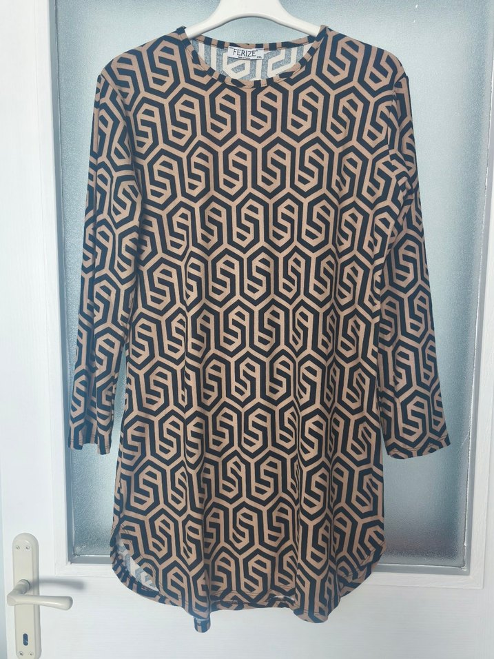 Uzun kollu, bol kesim, uzun boy kadın tunik. Sentetik kumaştan, kahverengi yılan desenli ve zincir detaylı.