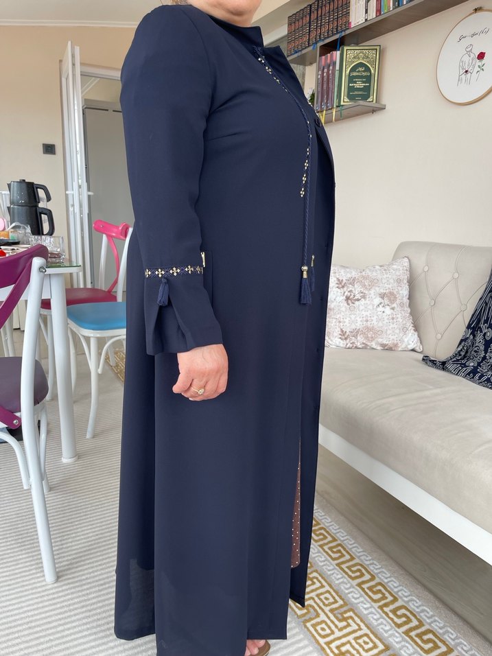 Uzun kollu, lacivert kadın elbisesi; yakasında çentikli yaka ve kol ile ön kısımda zincir detayları bulunur. İş ortamına uygun, nakışlı ve rahat kesimlidir. Temiz kullanıldı