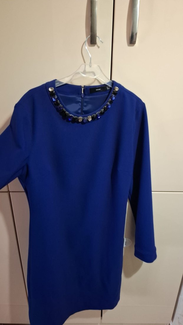 Zincir detaylı, uzun kollu, fitted kesim mavi abiye elbise. Yuvarlak yakalı ve parlak dokulu, günlük ve iş stiline uygun uzun boy.