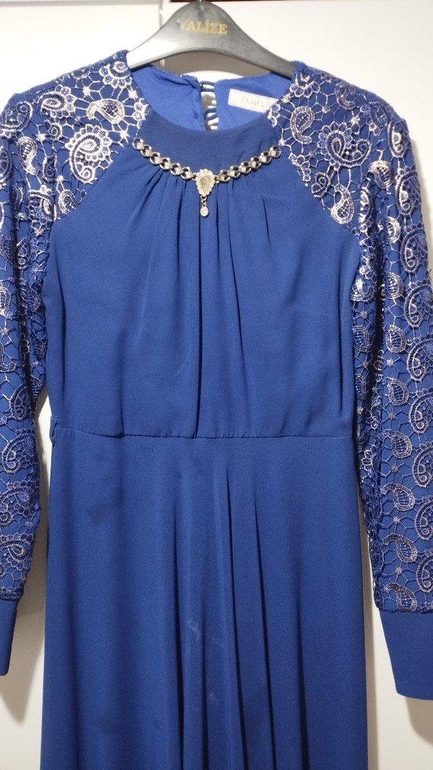 Fitted kesim, yüksek yakalı ve uzun kollu bu uzun abiye elbise, işlemeli dantel detaylarına sahiptir. Parlak mavi kumaş, yakada zincir detayı ile klasik ve modern bohem tarzı birleştirir. Düğünler için uygun.
