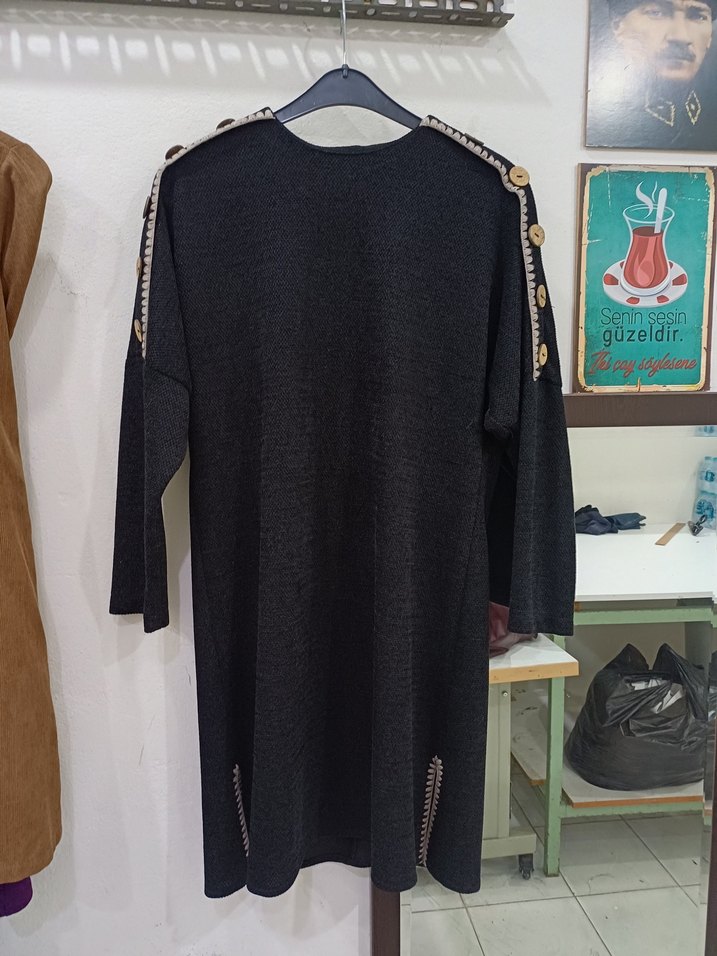Uzun kollu, salaş kesim siyah tunik, zincir detayları ve parlak nakış desenleriyle dikkat çekiyor. Rahat sentetik kumaştan, günlük şıklık için ideal.