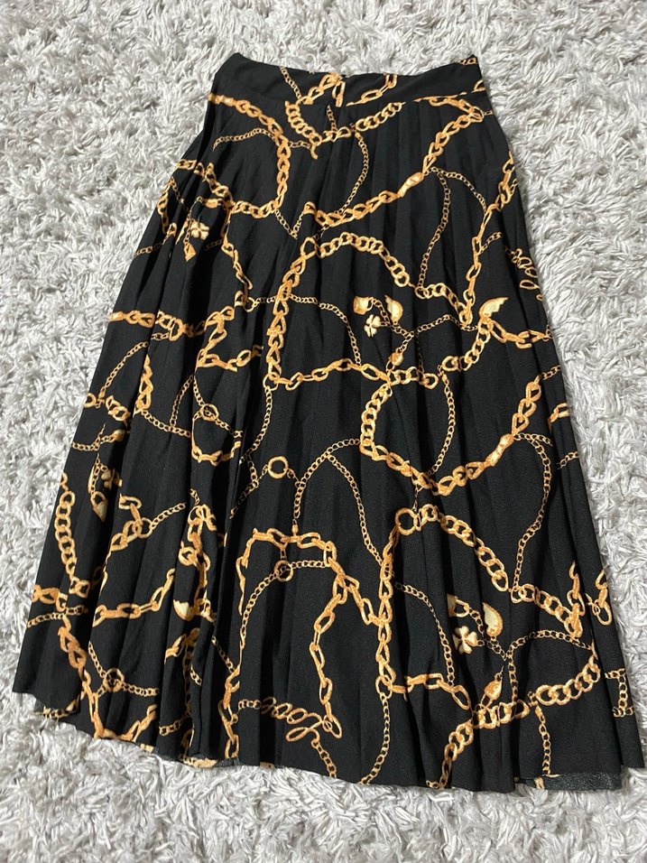 Hafif ve saten dokulu, zincir desenli uzun ve bol kesim etek, bohem tarz için uygundur.