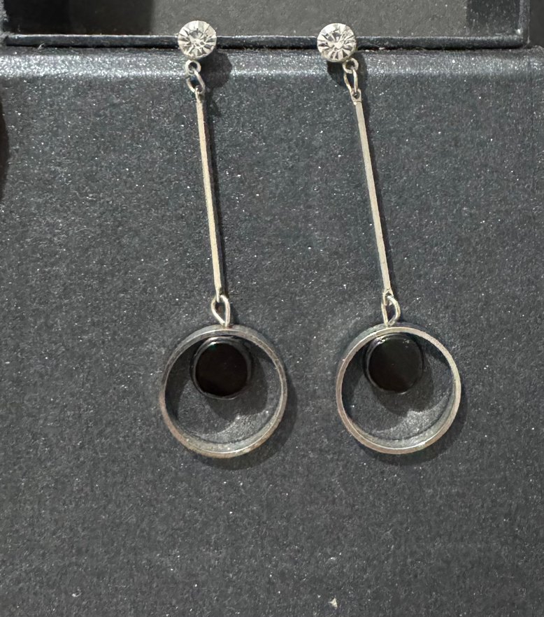 Zincir detaylı, uzun siyah minimalist küpeler. Desensiz dairesel detaylara sahip, romantik akşamlar için uygun.