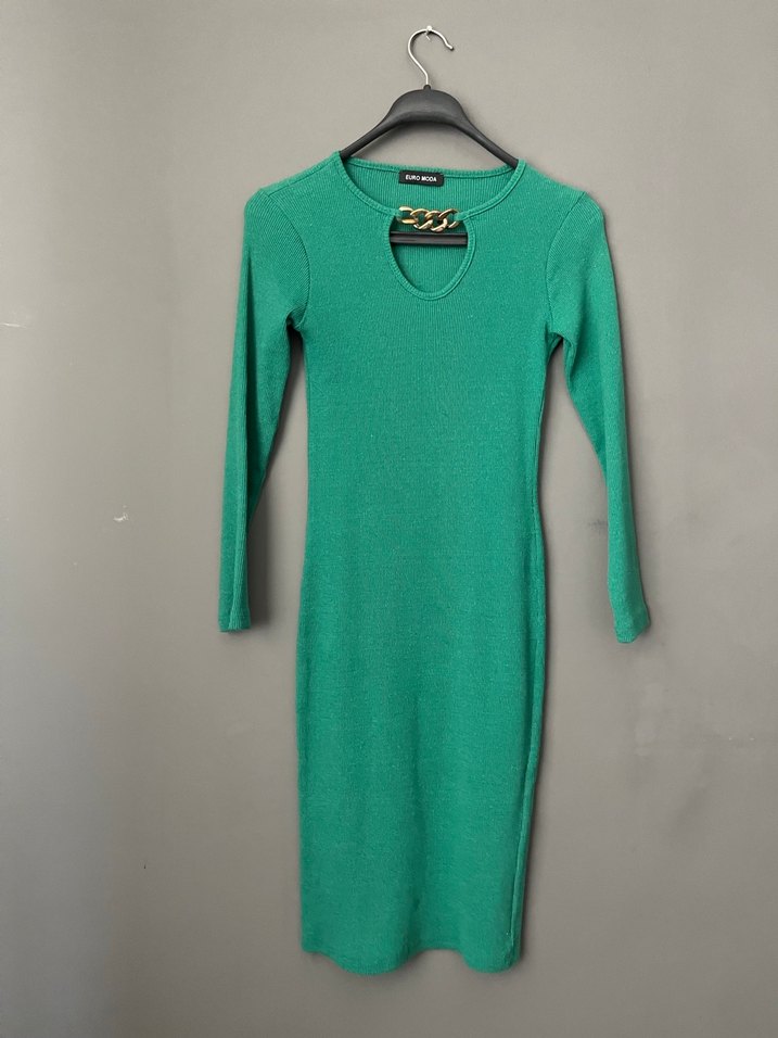 Uzun, dar kesim triko elbise; uzun kollu ve yuvarlak yaka, göğüs kısmında zincir detayına sahiptir. Canlı trengiyle günlük rahat kombinlere uygundur.