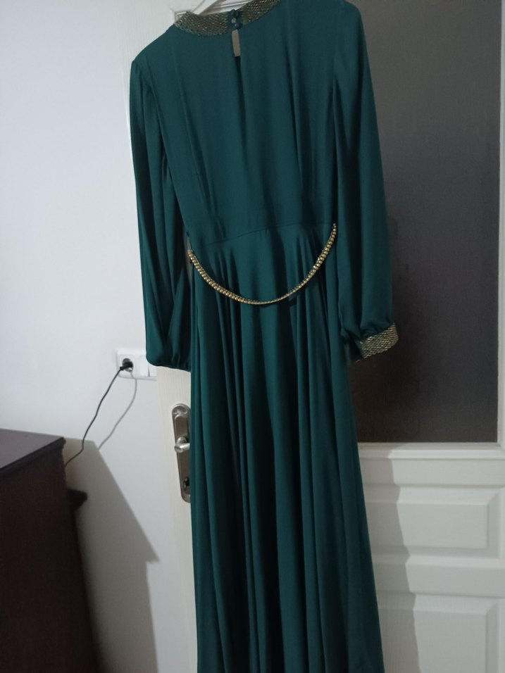 Uzun yeşil abiye elbise, salaş kesim, askılı kollar ve yuvarlak yaka. Bel ve manşetlerde parlak zincir detayları bulunur.