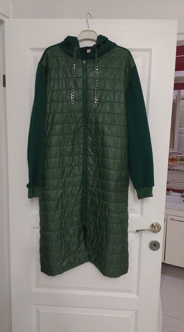 Zincir detaylı, kapüşonlu uzun yeşil ceket. Yumuşak ve sıcak kumaştan, bol kesim ve uzun kollu, günlük kullanıma uygun. kolunda pütürlenme var biraz tüy toplayıcım yoktu