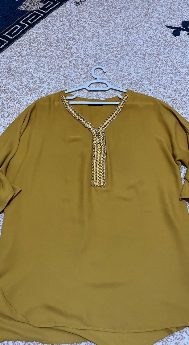 Bej renkte, zincir detaylı V yaka, uzun kollu, bol kesim ve uzun boy tuniktir. Sentetik kumaştan yapılmış, nakışlı ve parlak görünümlüdür. Trendy günlük giyim için uygundur.