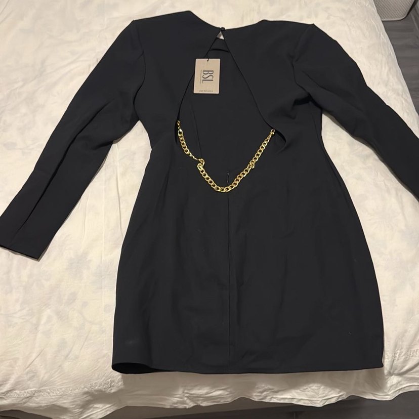 Dar kesim midi elbise, uzun kollu ve V yakalıdır. Sırtında altın renk zincir detayı bulunur. Minimalist tasarımıyla sokak modasına ve romantik akşamlara uygundur. ✨ sırtı dekolteli zincirli etikette L yazıyor ama kalıp s ye uygundur