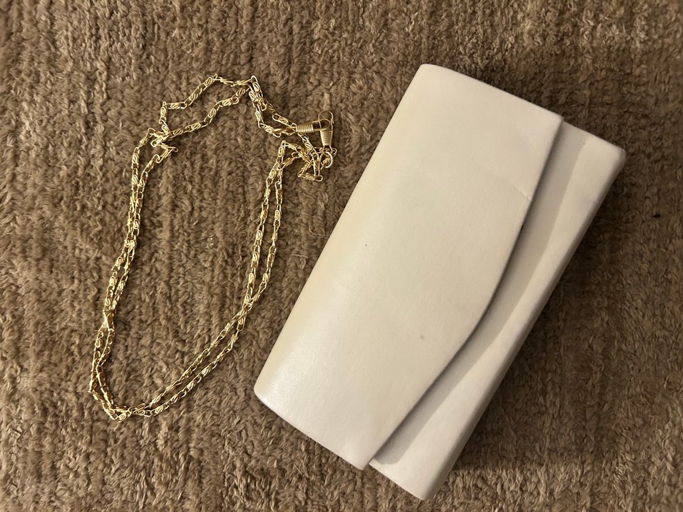 Zincir detaylı, parlak beyaz deri vintage tarzı çanta düğün davet vs için kullanmıştım 2 3 kere tertemiz altın zincir askısıyla gönderilecektir markasını bilmiyorumm