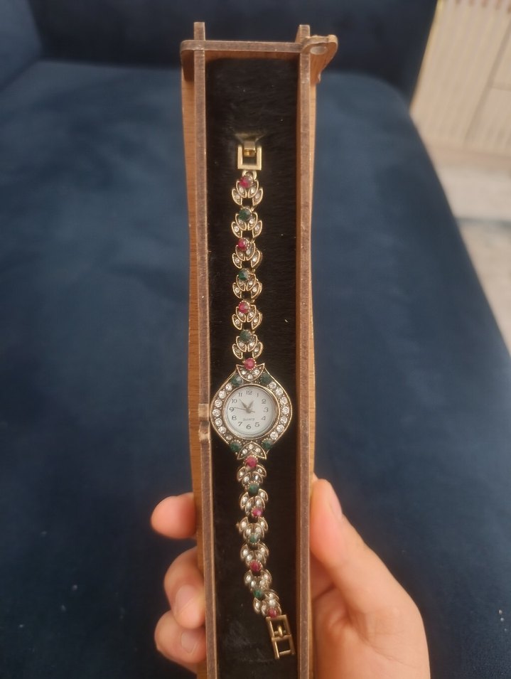 Zincir detaylı, renkli taşlı koyu altın tonlarında vintage tarzda kadın saati. ⌚