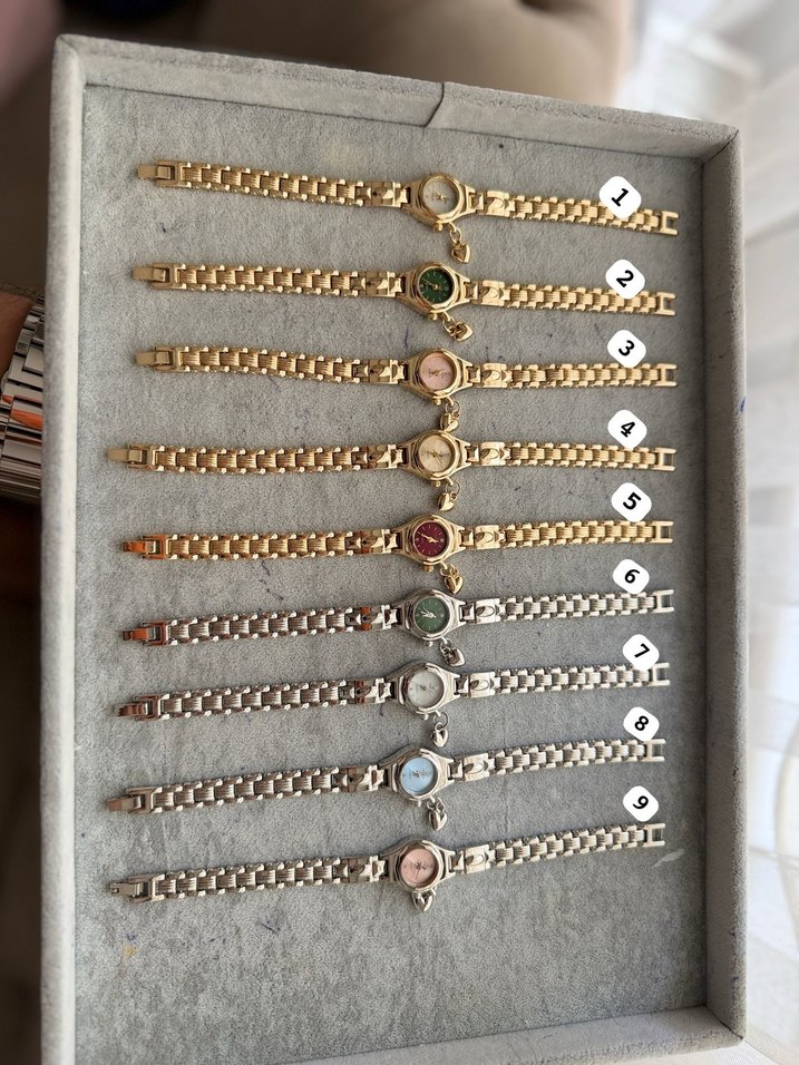 Zincir detaylı bilezik kordonlu, çok renkli kadranlı vintage tarzda kadın saatleri. Her biri farklı renkte yuvarlak kadranlara sahiptir. ⌚