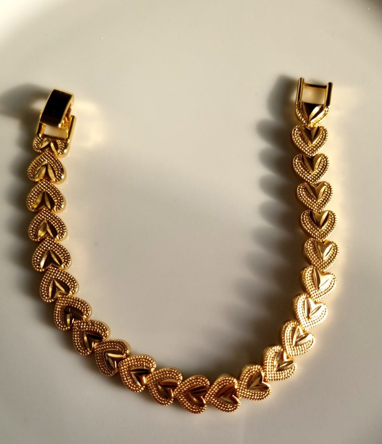 Parlak altın renkte, zincir detaylı ve kalp desenli vintage tarzda bileklik. Romantik akşamlar için klasik şıklık sunar. Vip ürünler pirinç (bronz) hammaddesi kullanılarak üretilmektedir. Kaplamaları üst kalite olan bu ürünler, sıvıya karşı dayanıklı, kararma yapmayan, antialerjik ve günlük kullanıma uygundur. Ürün süslemelerinde kullanılan taş cinsi zirkon taştır.