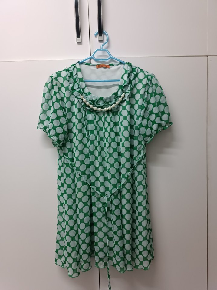 Yeşil renkli, zincir detaylı, kısa kollu, yuvarlak yakalı, bol kesim bohem tarzda triko bluz. Canlı renkli batik deseni ve midi boy uzunluğa sahiptir.