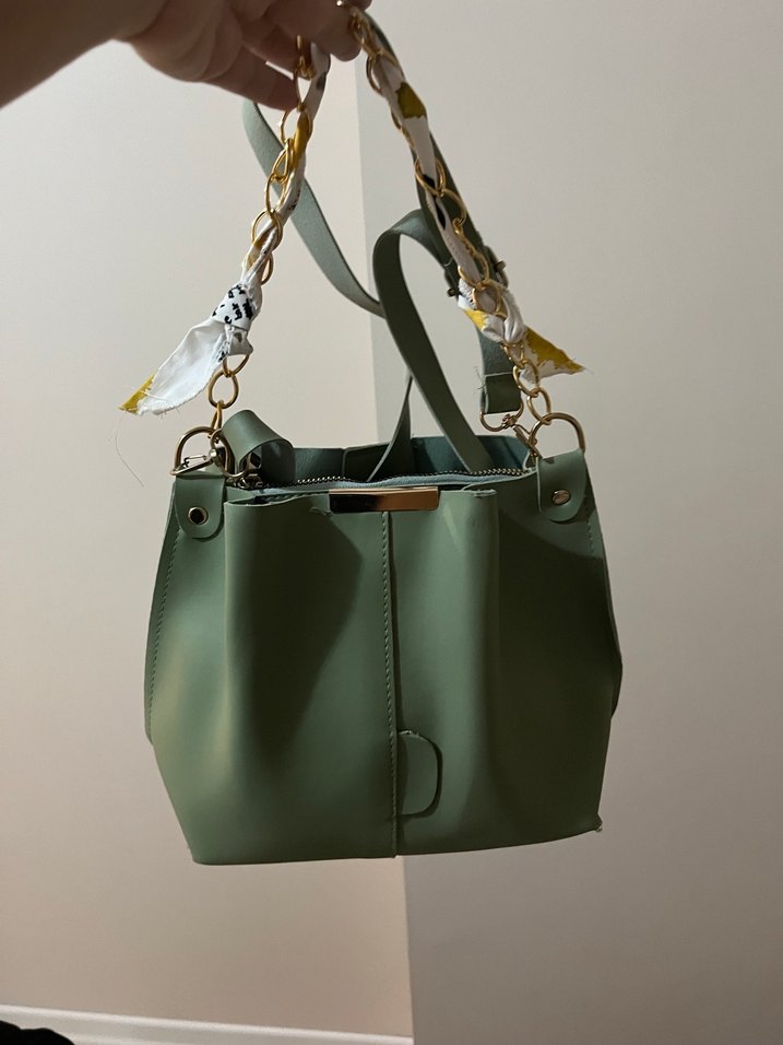 Zincir detaylı ve fular aksanlı yeşil deri kadın çanta, günlük kullanım için uygun, trend sokak stili görünümünde.