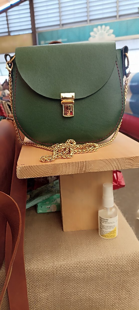 Yeşil deri kadın çanta, zincir detaylı ve modern klasik tasarıma sahip, günlük kullanıma uygun bohem tarzda. Elde üretilmiştir