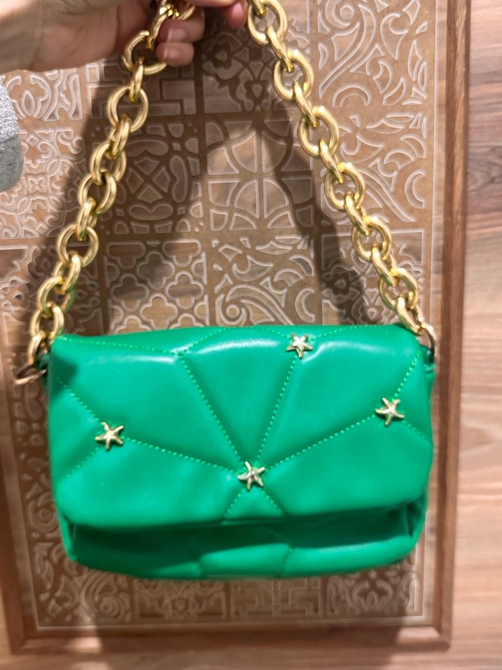 Ece’nin butiğinden alındı Yeşil deri kadın çanta, parlak yüzey ve altın zincir detaylarına sahiptir. Nakışlı yıldız desenleriyle Parisli ve bohem sokak stili karışımıdır.