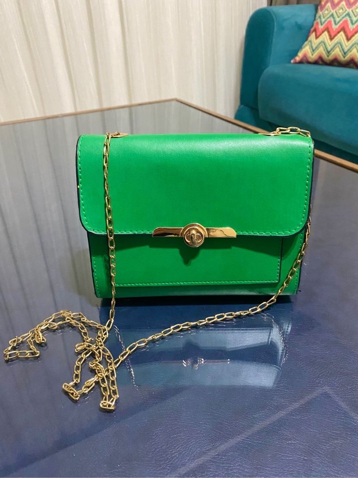 Yeşil deri çanta, zincir detayı ve klasik modern tarzıyla günlük kullanıma uygun. Desensiz tasarımıyla renkli bir dokunuş sağlar.