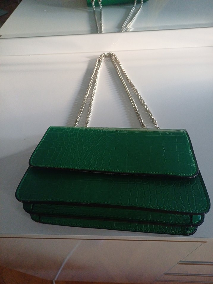 Zincir detaylı, parlak yılan derisi desenli yanlis hatirlamiyorsam cilalanmis deri, sert deri.zinciri 2 sekilde kullaniliyor. icinde 2 bolum var. boy 14 cm en 22 cm ic derinlik 12 cm zincir kisa hali 26 cm uzun hali 48 cm #çanta #deriçanta #hotiç #portföy