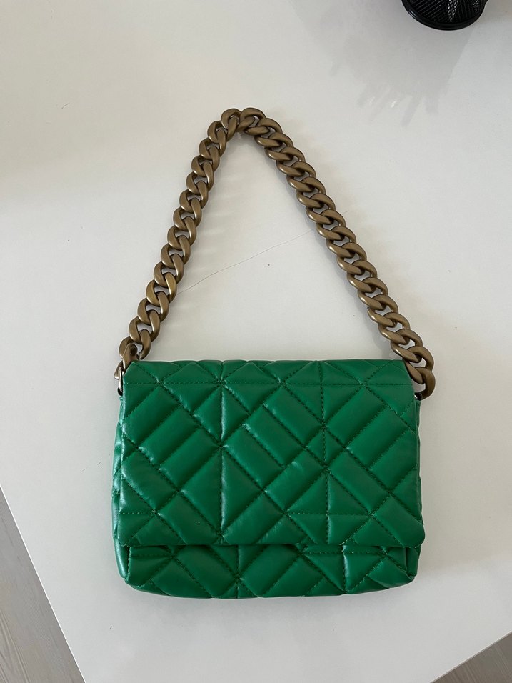 Parlak yeşil deri kadın çanta, zincir detaylı ve sokak modasına uygun, günlük kullanım için idealdir.