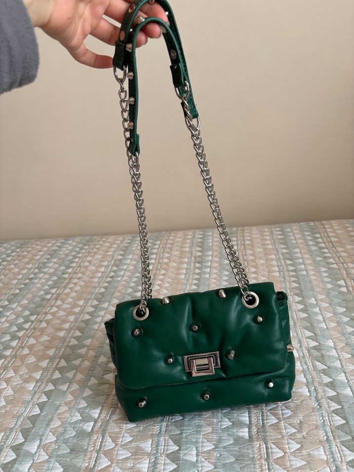 Koyu yeşil yılan derisi desenli deri çanta, zincir ve perçin detaylarıyla trendy sokak tarzına uygun. Gümüş tonlu aksesuarlar içerir. Zımba detayının bir tanesi yok aldığımda da öyleydi alırken farketmemiştim hiç kullanmadım