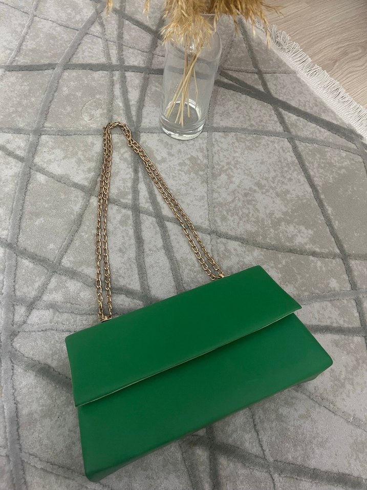 Zincir askılı, parlak yeşil sentetik kumaştan yapılmış, minimalist ve çağdaş tarzda günlük kullanıma uygun kadın çantası.
