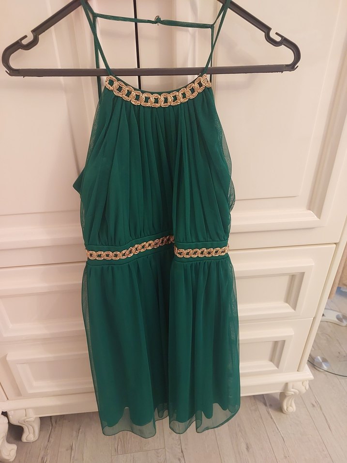 Yeşil kisa abiye elbise, ince askılı ve straplez yakalıdır. Gevşek kesimi, işleme detayları ve parlak zincir süslemeleriyle bohem parti stiline uygundur.